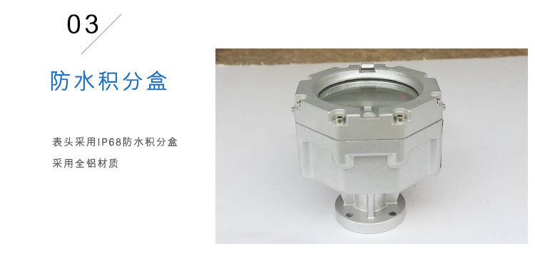 1、鋁殼積分表頭、帶防水功能、可適應一些戶外雨季等潮濕產(chǎn)所‘