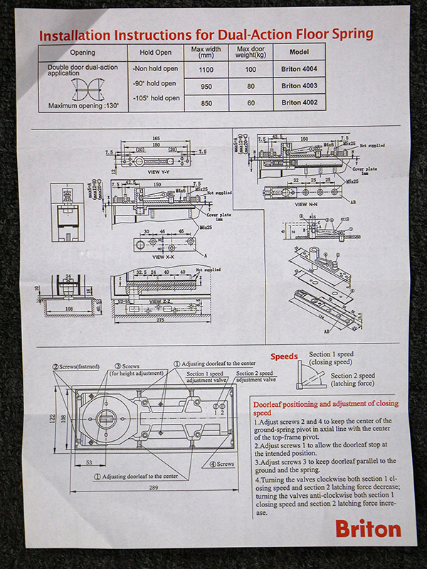 安 朗杰地彈簧工藝精良,符合中國國家標準qb/t 2679,超薄的缸體設(shè)計,更是適用于大部分應(yīng)用場合。briton必騰4000系列歐式地彈簧提供90°停門功能,開門角度為120°可選,適用于玻璃門、鋁門、木門及各類門扇。