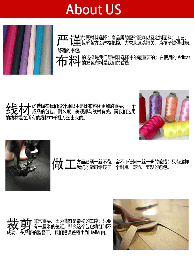 廣東永燦手袋是一家集設計、訂制、生產(chǎn)學生書包、旅行包、背包、以及其他箱包手袋的訂制廠家。創(chuàng)建于2002年,位于東莞市橫瀝鎮(zhèn)金馬路,占地5500平方米,國內(nèi)的永燦書包品牌youngsunstar主打生產(chǎn)孩子的學生書包,筆袋,ipad袋,挎包,背包等。