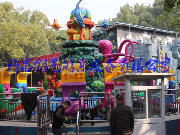 歡樂(lè)海洋島游樂(lè)設(shè)備可乘坐24人,設(shè)備中配備有水槍裝置,當(dāng)游客乘坐在飛船上時(shí),設(shè)備啟動(dòng),游客一邊乘坐會(huì)旋轉(zhuǎn)的飛船,一邊可用船上的水槍或者激光對(duì)準(zhǔn)各個(gè)目標(biāo),當(dāng)目標(biāo)被擊中后,便會(huì)做出噴水,舉手等各種動(dòng)作,姿態(tài)可愛(ài),趣味性強(qiáng)。而位居正中的"八爪魚(yú)”被射中后還會(huì)噴出水柱,向游客發(fā)起“還擊”, 增加了互動(dòng)性,游客更能從中享受到歡樂(lè)海洋帶來(lái)的歡樂(lè)。不過(guò)您也不用害怕章魚(yú)先生的水珠會(huì)真的噴到游客身上,我們的座艙就是一個(gè)保護(hù)傘,保護(hù)著游客不被水柱噴到身上,八爪魚(yú)噴水增加了游樂(lè)設(shè)備的趣味性和刺激性,使更多的游客玩了還想玩。 本公司設(shè)備實(shí)行售后三包,公司實(shí)行設(shè)備保修一年,終身維修,為客戶提供高質(zhì)量設(shè)備及盡善盡美的售后服務(wù)。歡迎選購(gòu)。粉 和綠的搭配,水和船的協(xié)調(diào),設(shè)備上安 裝了水槍裝置,當(dāng)游客乘坐時(shí),游客可以用水槍射擊中間章魚(yú)和其他目標(biāo),當(dāng)游客射中目標(biāo)時(shí),中間的目標(biāo)會(huì)做出噴水,舉手等各種動(dòng)作,憨態(tài)可掬,趣味性強(qiáng)。而位于中間的“大章魚(yú)”被射中后還會(huì)噴出水珠,向游客發(fā)起“攻擊”使游客全身心的投入,增加了互動(dòng)性,游客更能從中享受到歡樂(lè)海洋帶來(lái)的歡樂(lè),中間大章魚(yú)的噴水增加了游樂(lè)設(shè)備的趣味性和刺激性,使更多的游客玩了還想玩。