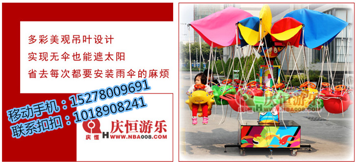 供應(yīng)慶恒游樂設(shè)備電動廣場兒童新款游樂設(shè)備旋轉(zhuǎn)秋千魚,福建飛魚,座位魚和上面的12根支架可很方便的拆卸,拆卸后一輛電瓶三輪車就可運輸。我們慶恒這款秋千魚配有精美彩燈,提供夜間/白天兩種彩燈模式,可使用遙控控制彩燈變幻。底座下面有4只直徑10厘米帶剎車的旋轉(zhuǎn)工業(yè)輪。秋千魚電機可手動控制和遙控控制。旋轉(zhuǎn)速度可隨意調(diào)節(jié)?刂葡鋷в幸魳罚蚣軒в芯篱W爍霓虹燈(對孩子們更有吸引力)。