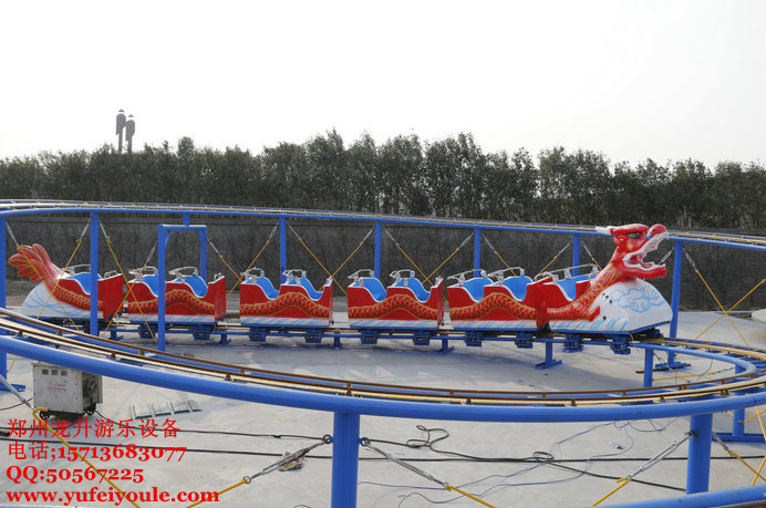 “滑行龍”游藝機(jī)以龍尾造型,整個列車由前后兩個傳動部驅(qū)動,沿著兩個螺旋形軌道行駛,時而盤旋