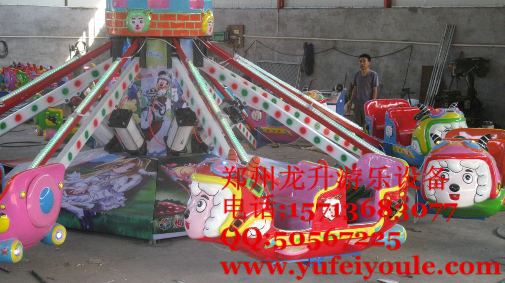 產品介紹“自控飛羊”是由機械、氣動與油壓和電氣系統(tǒng)組成,是一種繞垂直軸中心旋轉、升降自由的游樂設備 。飛機圍繞中心火箭旋轉,并逐漸上升,游客在飛行中緊握操縱桿隨意升降,互相追逐、射擊,形象逼真的空戰(zhàn)聲光效果,令人樂而忘返,該游樂設備不但性能優(yōu)異操作簡單,而且以新穎的造型、華麗迷人的彩 燈裝飾,逼真刺激的空戰(zhàn)音響效果。它具有高空駕駛之驚險,自由之悠閑,是一種游客可以自己控制升降 的現(xiàn)代游樂設施。 喜羊羊暖羊羊美羊羊看來看去還是一只羊,喜羊羊灰太狼來啦!“自控飛羊”是一款眾多小朋友 歡的游樂設備,羊羊圍繞中心火箭或其他造型的裝飾旋轉,并自由控制上升,游客在飛行中緊握操縱桿隨意升降,互相追逐、射擊,形象逼真的空戰(zhàn)聲光效果,令人樂而忘返。 該設備是由小朋友喜歡的動畫片喜洋洋灰太狼來構造的精美玩具,色彩鮮艷。其中心還具有美麗的噴