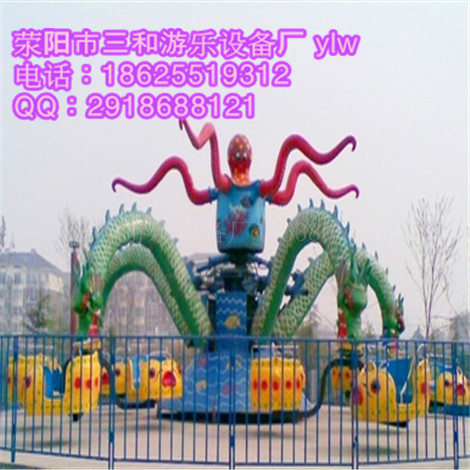 大章魚屬臂類兒童游樂設(shè)備,外觀可愛,造型生動有趣,在各大中小型游樂場所較為常見。設(shè)備開始自行繞中間的回轉(zhuǎn)軸轉(zhuǎn)動,同時(shí)各座艙也同時(shí)水平旋轉(zhuǎn),大章魚的旋臂隨著中回轉(zhuǎn)軸的轉(zhuǎn)動而上下浮動,如龐大的章魚在舞動自己的爪子。氣勢磅礴,非常壯觀。小朋友做在其中覺得極為刺激驚險(xiǎn),所以一直深受小朋友的歡迎。