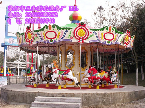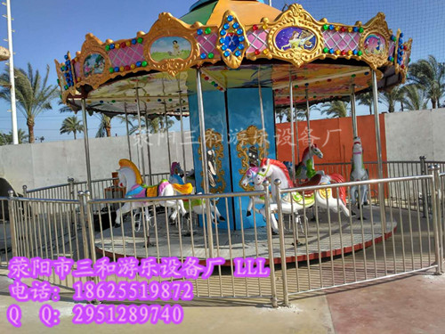 “豪華轉(zhuǎn)馬”顧名思義就是豪華的旋轉(zhuǎn)木馬,它是一種垂直軸類單轉(zhuǎn)體起伏型游藝機(jī),是模擬跑馬廳的娛樂活動(dòng)而設(shè)計(jì)的,該游藝機(jī)的上部設(shè)有彩色的錐形頂棚,頂棚的周圈裝有五彩繽紛的玻璃鋼裝飾板,更顯豪華氣派,儼如華麗的跑馬廳。廳中央有起伏奔跑的大小馬群,設(shè)備啟動(dòng)后,馬群、馬車競相賽跑,形成一個(gè)萬馬奔騰的場面,乘客如同參加一場跑馬比賽,無不感到心曠神怡,樂趣無窮! 家長可以帶著孩子們,小情侶們也可以一塊乘坐來促進(jìn)彼此之間的感情。