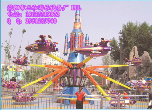 自控飛機(jī)”是由機(jī)械、氣動與油壓和電氣系統(tǒng)組成,是一種繞垂直軸中心旋轉(zhuǎn)、升降自由的游樂設(shè)備。飛機(jī)圍繞中心火箭旋轉(zhuǎn),并逐漸上升,游客在飛行中緊握操縱桿隨意升降,互相追逐、射擊,形象逼真的空戰(zhàn)聲光效果,令人樂而忘返,該游樂設(shè)備不但性能優(yōu)異,操作簡單,而且以新穎的造型、華麗迷人的彩燈裝飾,逼真刺激的空戰(zhàn)音響效果。它具有高空駕駛之驚險,自由之悠閑,是一種游客可以自己控制升降的現(xiàn)代游樂設(shè)施。自控飛機(jī)有6臂和8臂(可根據(jù)客戶要求進(jìn)行定制)中央火箭和大臂配有彩燈,夜晚開放更是美麗壯觀!