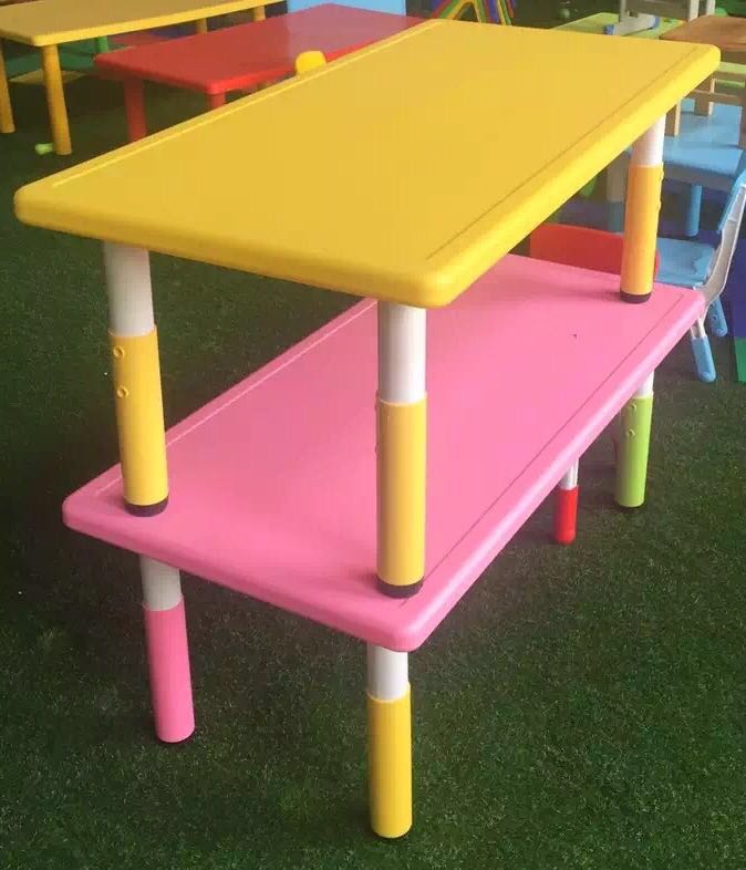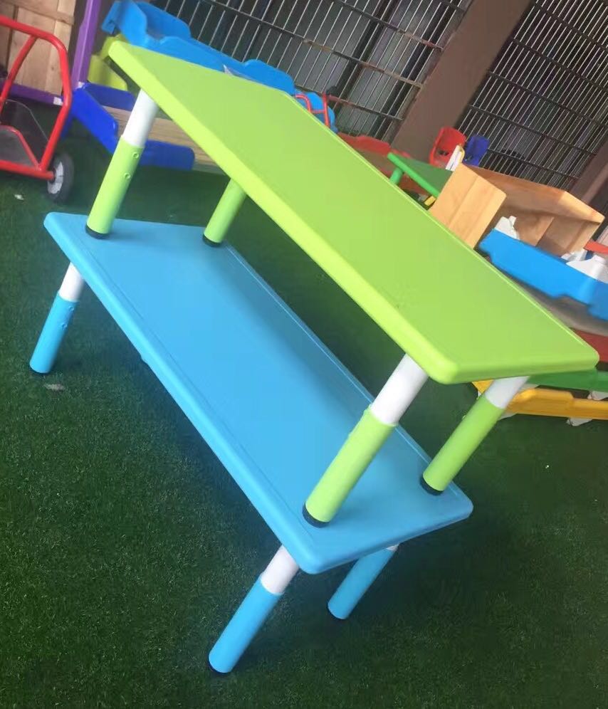 選用pe環(huán)保材料,吹塑成型,經(jīng)久耐用,不受氣候溫度影響而變形,桌面材料可回收翻新。桌面邊緣人性化設計,具有防滑功能,耐臟,易清洗。桌腳可根兒童身高及不平整地面自由調(diào)節(jié)高度,并帶有橡膠墊,防止滑動和刮傷地板。