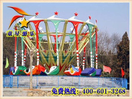 “超級秋千”,外形象一個五顏六色的巨型花籃,外檐懸掛有十四條紅綠相間的長臂。當花籃運轉時,氣動裝置將掛有座艙的長臂高高撐起,接著又緩緩收落。