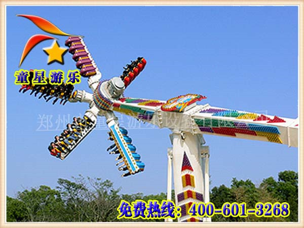 極速風(fēng)車是新創(chuàng)意及用高科技打造的大型游樂(lè)設(shè)施,在天空中就象一把伸展的大風(fēng)車,游客坐在“風(fēng)車葉片”上,立柱緩緩?fù)衅,然后大臂正反公轉(zhuǎn),座艙托臂急速正反自轉(zhuǎn),在離心力作用下座艙自旋,三種運(yùn)動(dòng)的疊加結(jié)合,風(fēng)車可在18米高空360度優(yōu)美自由翻滾。