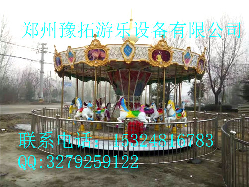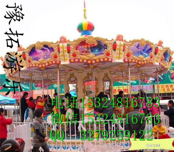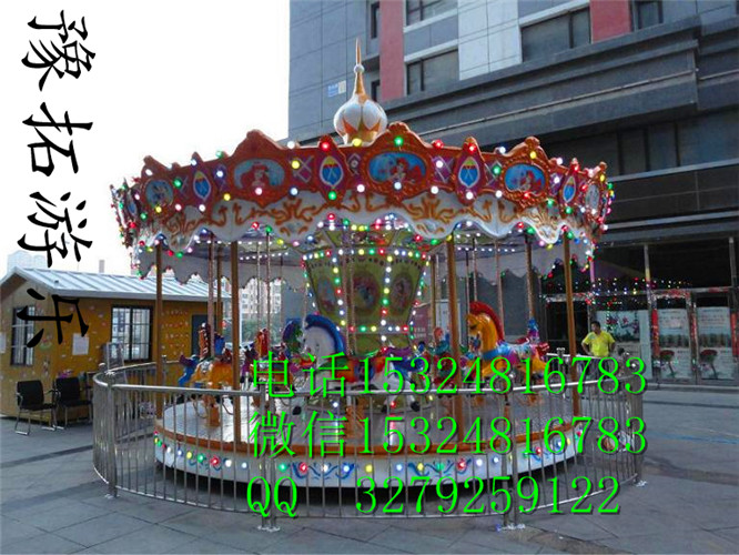 豫拓游樂“豪華轉(zhuǎn)馬”游藝機是模擬跑馬廳的娛樂活動而設(shè)計的,該游藝機的上部設(shè)有彩色的錐形頂