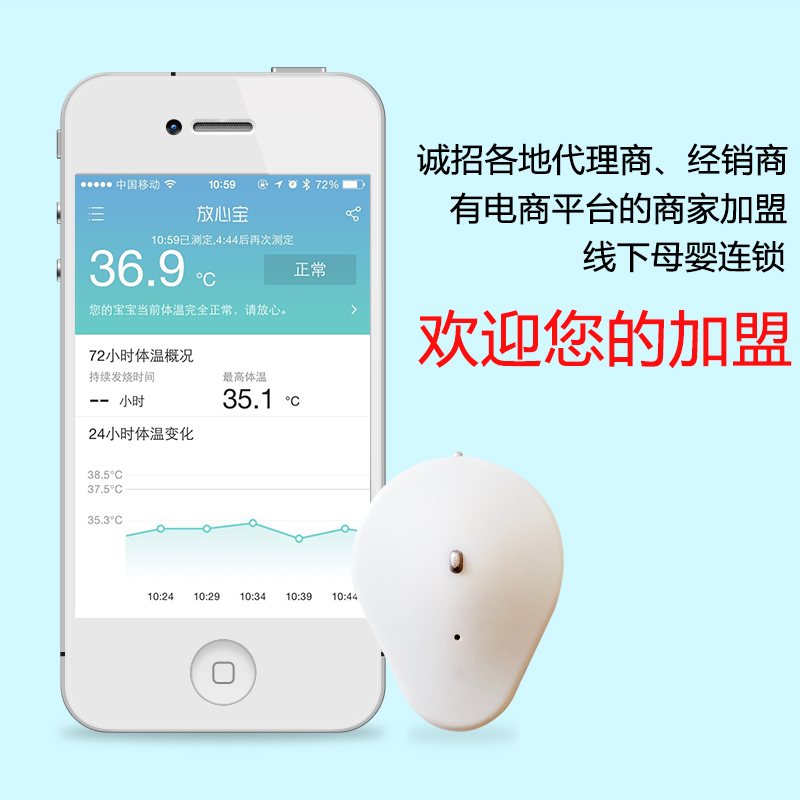 2014年度最新可穿戴專利產(chǎn)品,輕松科學(xué)及時(shí)照顧生病寶寶,測(cè)量體溫方式的革命性改變,通過(guò)藍(lán)牙與手機(jī)對(duì)接,體溫異常手機(jī)自動(dòng)報(bào)警,24小時(shí)不間斷的檢測(cè)并記錄體溫變化