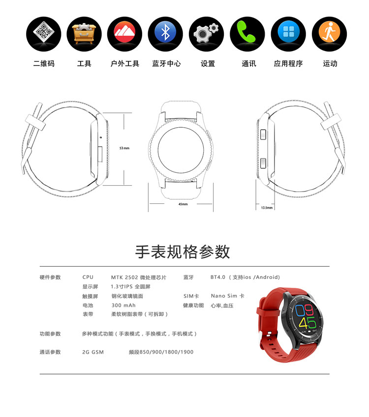 多種模式功能:手表模式,手環(huán)模式,手機模式