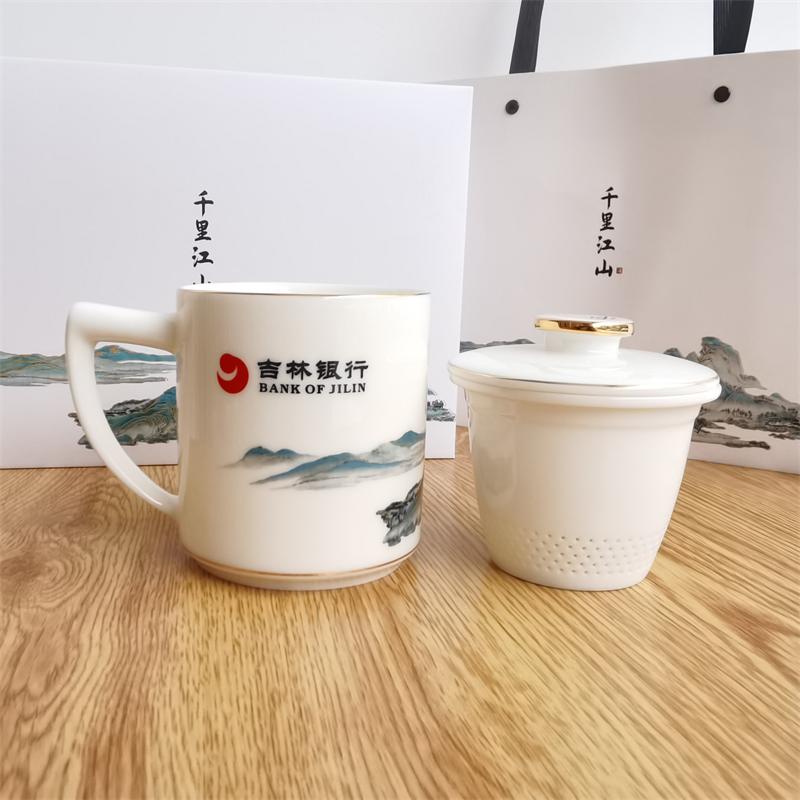 銀行禮品陶瓷茶杯定做廠家,銀行辦公禮品千里江山圖茶杯印標(biāo)