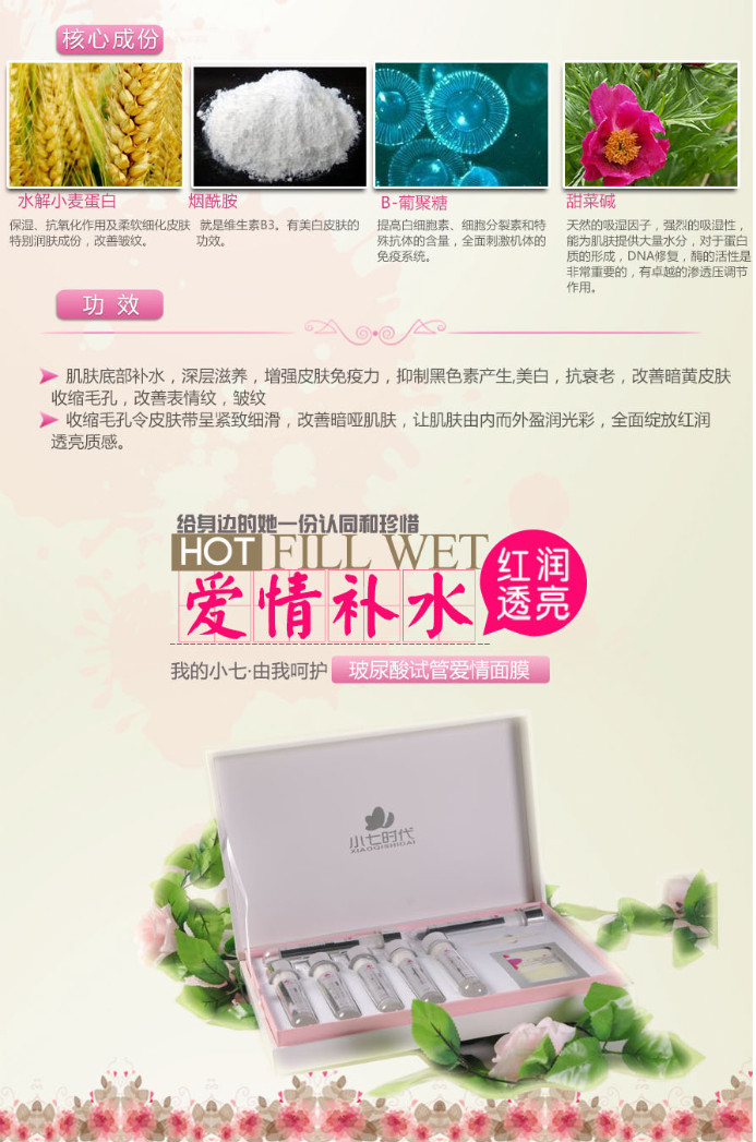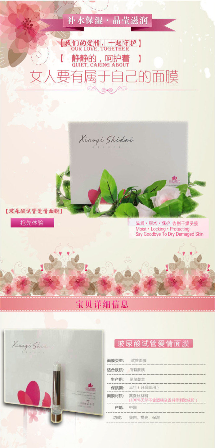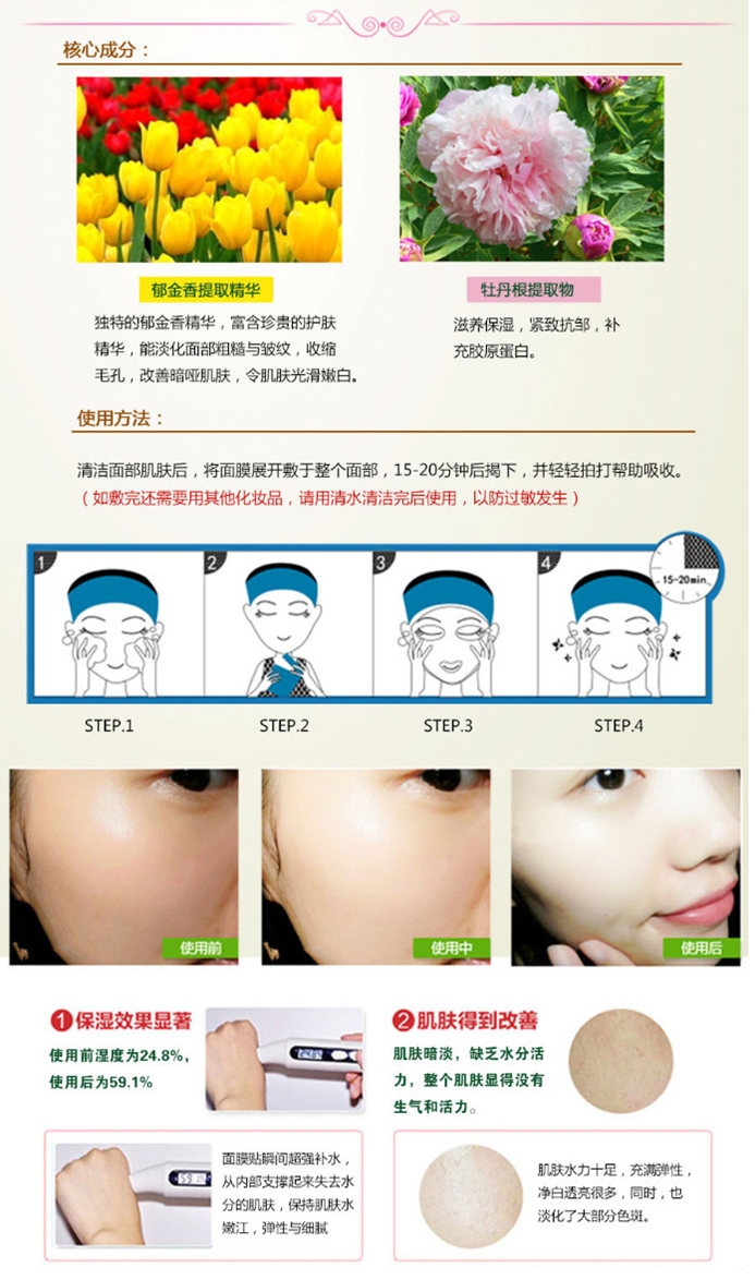 面膜材質(zhì):真絲材料(100%天然不含酒精及香料等刺激成分)