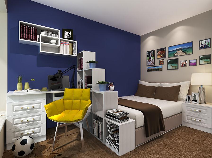 房間的設計簡單活潑,深色墻面和象牙白家具有一種視覺效果上的對比。學習區(qū)用高低錯落有致的格子置物架和睡床分隔開,增加空間層次感,形式也更自在。象牙白定制衣柜兩側是開放區(qū),轉角設計工藝高超,弧形展示區(qū)更人性化,提供最貼心的便利。