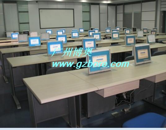 結 構:每張桌子配置2臺電動遙控液晶升降機(當時電腦時液晶顯示器自動重桌底升起且顯示器自動通電,當不使用顯示器時,顯示器自動隱藏于桌底),電腦桌前面設有檢修門,方便線路維修。