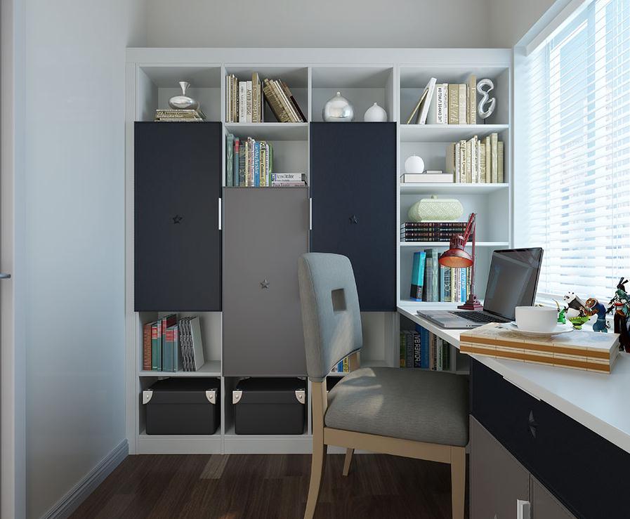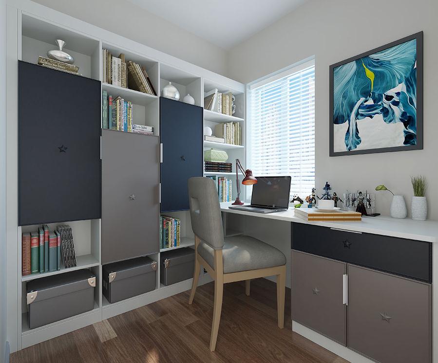 書房面積雖小但空間利用合理,書柜以象牙白為底色,門板為穿越藍(lán)和紳士灰,將書桌和書柜延伸結(jié)合,空間利用率更高,整體營造沉穩(wěn)寧靜的氛圍。