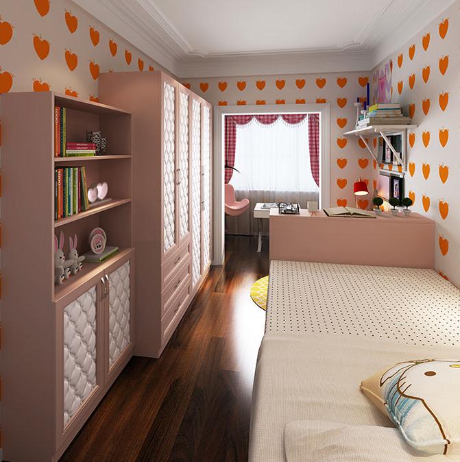 狹長型的空間兩側(cè)擺放家具,衣柜緊挨書柜,床與書桌并列,中間用隔斷收納柜隔斷。粉 色奠定浪漫夢幻的基調(diào),對空間的合理規(guī)劃和布局凸顯實(shí)用性和舒適度。