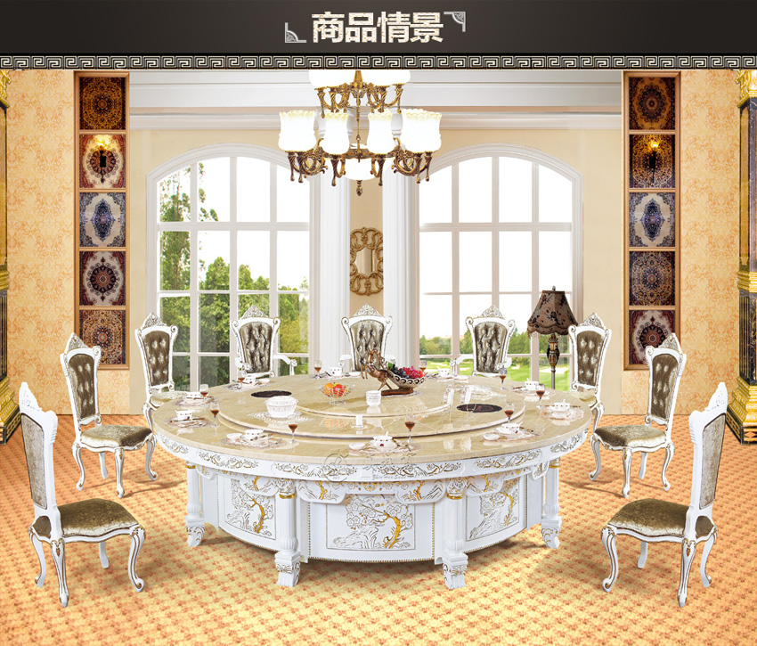 適用地點:星級酒店,飯店豪華包廂,高級會所,政府單位......等詳細說明:橡膠木框架,精工雕刻,貼金箔,青云石樹脂飾面臺面,轉(zhuǎn)盤自動轉(zhuǎn),遙控控制,內(nèi)部優(yōu)質(zhì)鋼架結(jié)構(gòu),特質(zhì)機芯,合資電機,臺灣“大寶”耐磨環(huán)保面漆。