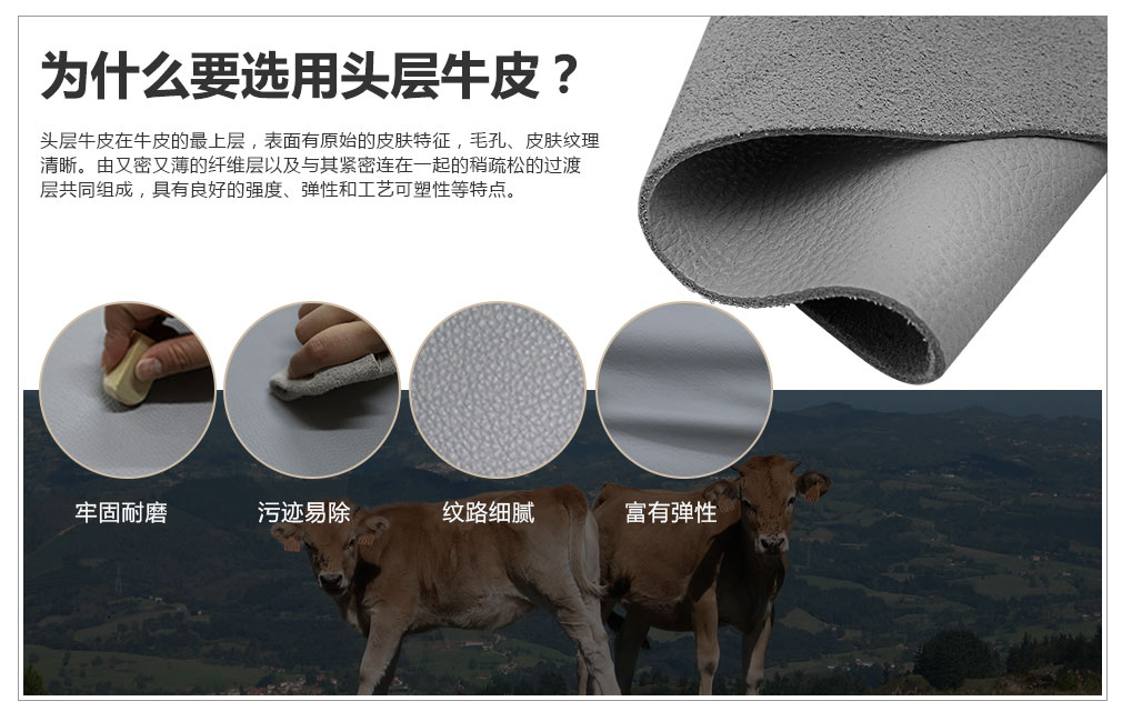 1.頭層牛皮打造:沙發(fā)的坐面、靠面和扶手均采用優(yōu)質(zhì)的頭層牛皮作為基料,觸感柔軟舒適,,具有超強(qiáng)透氣性,久坐也不悶。
