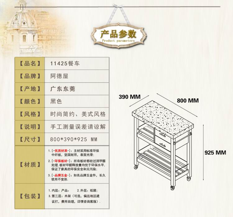 材質(zhì)選用出口專用p2級(jí)板材,具有美式鄉(xiāng)村的簡(jiǎn)約創(chuàng)作簡(jiǎn)樸、自然、愉悅的氛圍。仿大理石桌面,表面仿大理石工藝,防水、防刮、桌面清潔更加容易。側(cè)面掛位設(shè)計(jì),側(cè)面可放置毛巾,貼心、方便。大儲(chǔ)物空間,內(nèi)部結(jié)構(gòu)同樣經(jīng)得起挑剔的眼光,細(xì)節(jié)處依然講究細(xì)致的工藝?梢苿(dòng)車輪設(shè)計(jì),底部加有車輪,輕松移動(dòng)餐車,可鎖死車輪。運(yùn)輸采用紙箱包裝,軟床,柜子等包裝里面為珍珠棉、海綿皮貨氣泡袋,外層為防震制皮包裝,全程保護(hù)您的家具。