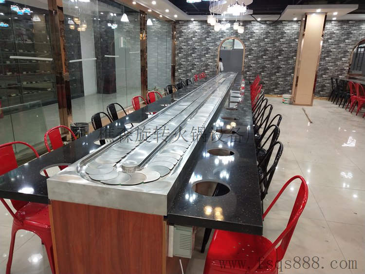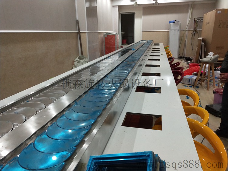 1.回轉小火鍋輸送設備根據需方店鋪平面圖紙或設計方案形狀長短而定。