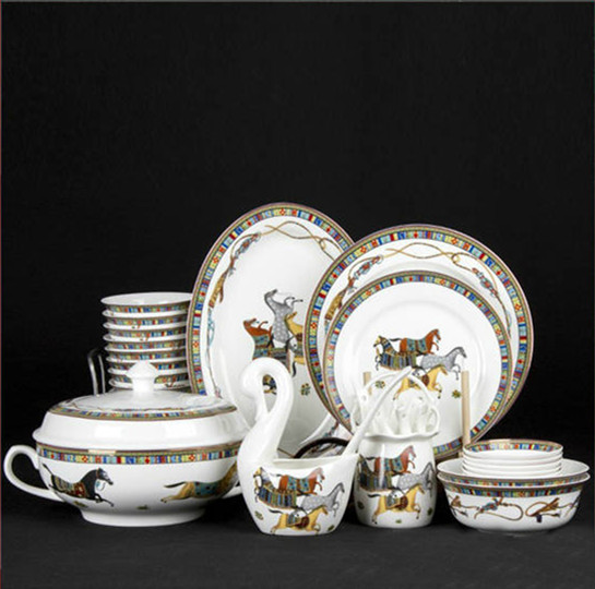 家用陶瓷餐具采用景德鎮(zhèn)優(yōu)質(zhì)高白泥,再添加一定比例的高原草食動物骨質(zhì)粉 ,混合而成的原材料。采用釉中彩技術(shù),經(jīng)過多次燒制打磨,再用1300度以上高溫?zé)贫伞?