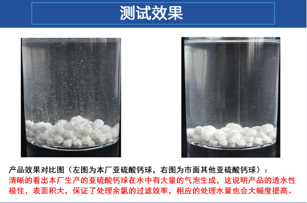 本產(chǎn)品為我廠生產(chǎn)的第三代亞硫酸 鈣球,采用“舌苔味蕾”仿生學技術精心制作,球體表面更加粗糙,表面積更大,處理水體效果更加優(yōu)秀;同時是由食品級亞硫酸 鈣和食品粘結劑 配置而成,應用我廠自創(chuàng)的先進技術,克服亞硫酸 鈣不易成型的缺陷,實現(xiàn)了球體長期牢固不破裂,且無粉 末脫落。生產(chǎn)過程嚴格合理,確保有效成分亞硫酸 鈣達到90%以上,是最理想的高效除余氯 產(chǎn)品,可以廣泛使用在家用水處理和工業(yè)水處理的領域。
