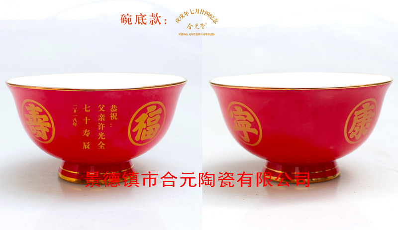 景德鎮(zhèn)合元陶瓷壽碗廠家支持金邊壽字碗定做,祝福語,壽星名字,時間,logo,照片等,還有其他款式的壽碗定制,質(zhì)量保證,歡迎客戶前來訂購。(廠家直銷,量大從優(yōu))破損由廠家負責(zé)、鄭重承諾。!聯(lián)系人: 小陳 t:13979895896 q:3481596812