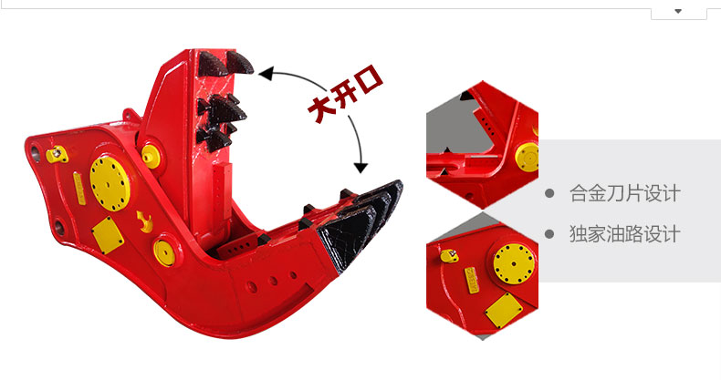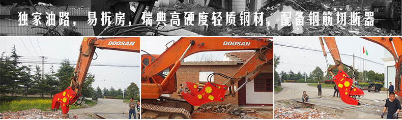 力道強(qiáng)勁=超高效率1、工作效率是破碎錘的二至三倍。 2、粉 碎鉗可以出色的完成一系列作業(yè):即將鋼筋從混凝土塊中分離出來(lái),折彎并裝載到卡車(chē)上,從而明顯的提高了工作效率。 3、作業(yè)完全機(jī)械化,安 全又省時(shí)。 大開(kāi)大闔=提高效率1、咬合密實(shí)間隙小,操作靈活。 2、大開(kāi)口設(shè)計(jì),工作輕松、方便。 3、裝有鋼筋切斷器,粉 碎鉗可以同時(shí)進(jìn)行兩項(xiàng)作業(yè),粉 碎混凝土并切斷暴露的鋼筋,使破碎作業(yè)效率更高。 堅(jiān)固耐用=節(jié)約成本1、采用瑞典高硬度輕質(zhì)鋼材,堅(jiān)實(shí)無(wú)比! 2、充分了解中國(guó)市場(chǎng)使用習(xí)性,針對(duì)磨耗部件及結(jié)構(gòu)件重點(diǎn)強(qiáng)化,壽命加倍! 3、顎齒制成了特殊形狀用以牢固的固定混凝土塊,楔入并粉 碎,以便進(jìn)行快速軋碎。顎齒非常堅(jiān)固,具有高耐磨性。 輕便快捷=創(chuàng)造效益1、拆裝容易,獨(dú)家油路設(shè)計(jì),不僅油缸速度加倍,并且可與破碎器通用,一機(jī)多任務(wù)。 2、低噪音無(wú)振動(dòng),滿足環(huán)保要求,適合城市與高新園區(qū)的拆除工程。 3、液壓油缸配有護(hù)蓋,用以阻攔混凝土塊和鋼筋的飛濺碎屑。