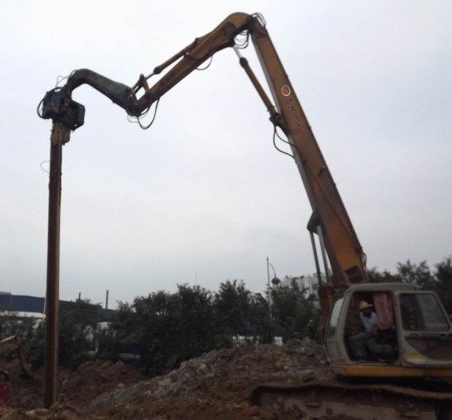 1、在選用直錘的情況下,20-24噸震動(dòng)錘只可以打6米-9米鋼板樁,并不建議在改裝時(shí)候選用此機(jī)型。6米鋼板樁在標(biāo)準(zhǔn)臂上直接裝震動(dòng)錘即可,9米鋼板樁需要在標(biāo)準(zhǔn)臂大臂襯套部位進(jìn)行改裝。9米以上必須做加長(zhǎng)臂。