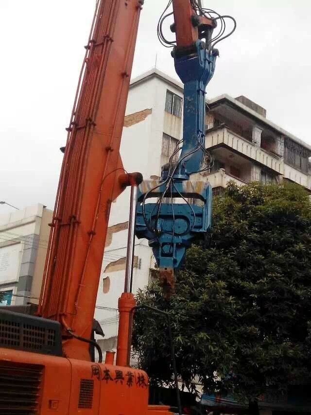 3、震動(dòng)錘,它是取自挖掘機(jī)液壓系統(tǒng)液壓通過(guò)專(zhuān)利技術(shù)安 裝變頻液壓管路?奢敵鲋鲃(dòng)力及加快流量。又可保護(hù)挖機(jī)主油泵不易損壞,利用總數(shù)為偶數(shù)偏心塊,以主速液壓進(jìn)口馬達(dá)作離心力旋轉(zhuǎn),從而產(chǎn)生正弦波狀垂直振動(dòng),再通過(guò)箱體底部夾具傳送給受力的樁體進(jìn)入到地下達(dá)到破壞樁體周?chē)叵峦临|(zhì)阻力。從而使振動(dòng)力樁體進(jìn)出自由。震動(dòng)錘在3分沙7分土的環(huán)境下工作***適合。太惡劣的功罪環(huán)境對(duì)于設(shè)備損傷較大。