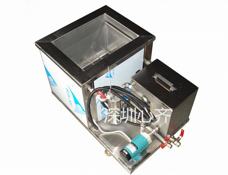 循環(huán)過濾超聲波清洗機(jī)主要由超聲波發(fā)生器(控制箱)、換能器、清洗槽、儲(chǔ)液槽、活動(dòng)腳輪、支腳、循環(huán)過濾系統(tǒng)及加熱系統(tǒng)等組成。