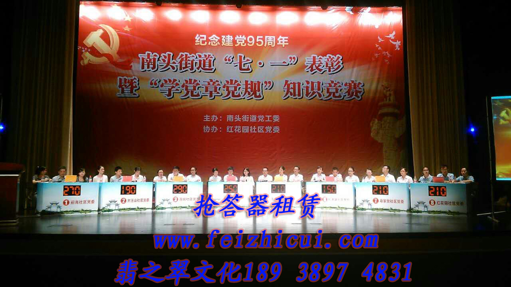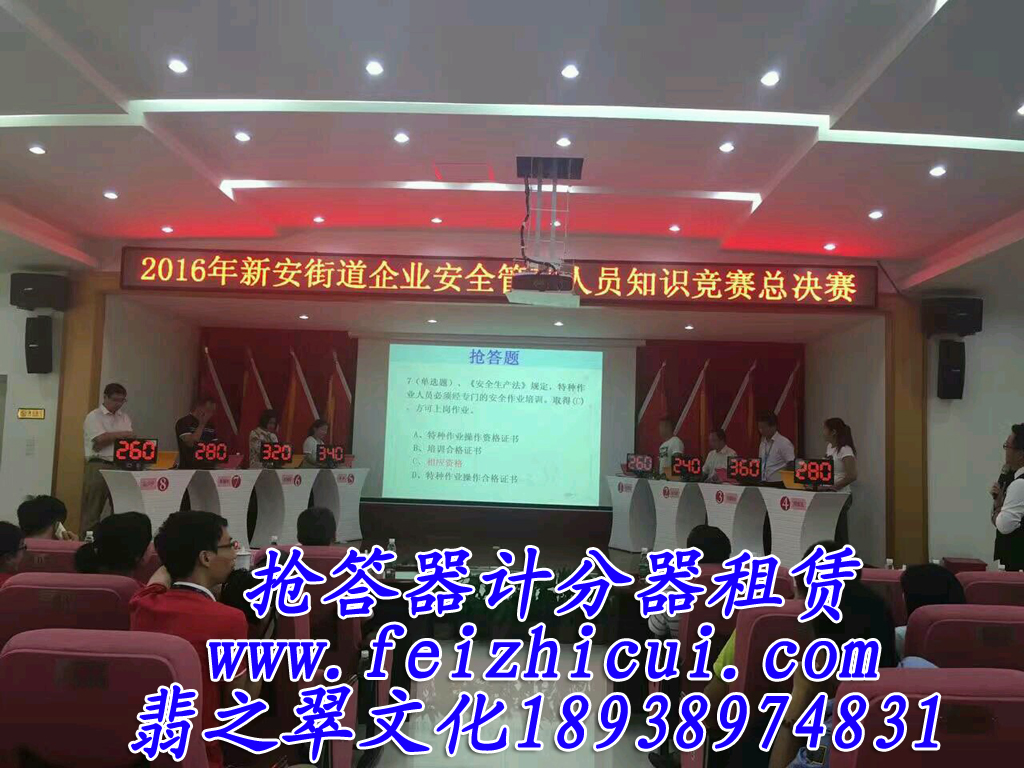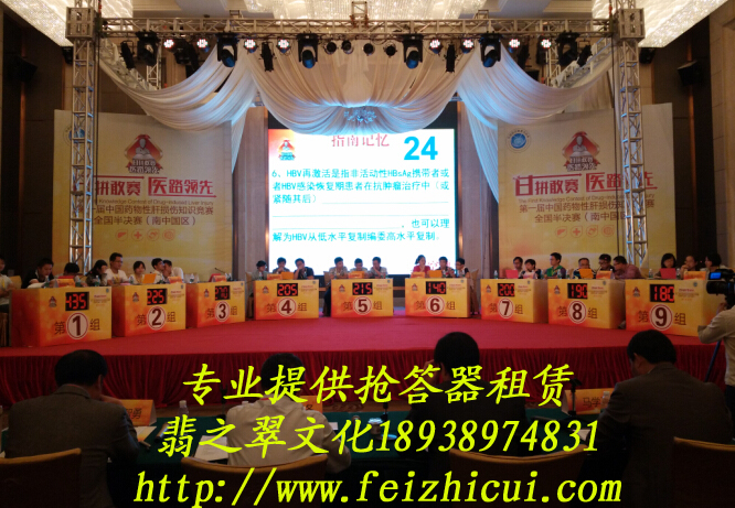 我公司是一家面向全國各地專業(yè)出租知識競賽搶答器、計分器的公司。公司研發(fā)的產(chǎn)品“電腦搶答器”是目前國內(nèi)外最為先進(jìn)的電腦搶答器。各種功能完善,包括搶答、記分、出題、公布答案、倒計時、宣布中場分?jǐn)?shù)及最后排名。比賽前我方工作人員提前安 裝調(diào)試好設(shè)備,并配合彩排。整場比賽過程中所有的設(shè)備(包括大屏幕,音箱、搶答、記分設(shè)備)均由我方一名工作人員后臺全程控制配合主持人,您不需要做任何事情。