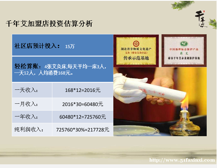 千年艾公司已被授牌為湖北省非物質(zhì)文化遺產(chǎn)“艾灸”傳承示范基地,授權(quán)使用國家地理標(biāo)志“蘄艾”、湖北省非物質(zhì)文化遺產(chǎn)“艾灸”、公司是擁有“公司+工廠+種植基地+養(yǎng)生實(shí)體店”全產(chǎn)業(yè)鏈模式,擁有兩大拳頭產(chǎn)品“千年艾”“艾葆蓓”;品牌價(jià)值和品牌效應(yīng)已經(jīng)在艾灸養(yǎng)生行業(yè)相當(dāng)成熟;能夠帶來較高的、持續(xù)的、穩(wěn)定的、成長性好的**。