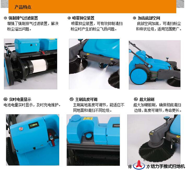 結力手推式掃地機,電動掃地車,噴霧掃地機,無動力掃地機可清掃鐵屑、顆粒料、粉 塵、樹葉、紙屑、煙蒂、沙土等垃圾。