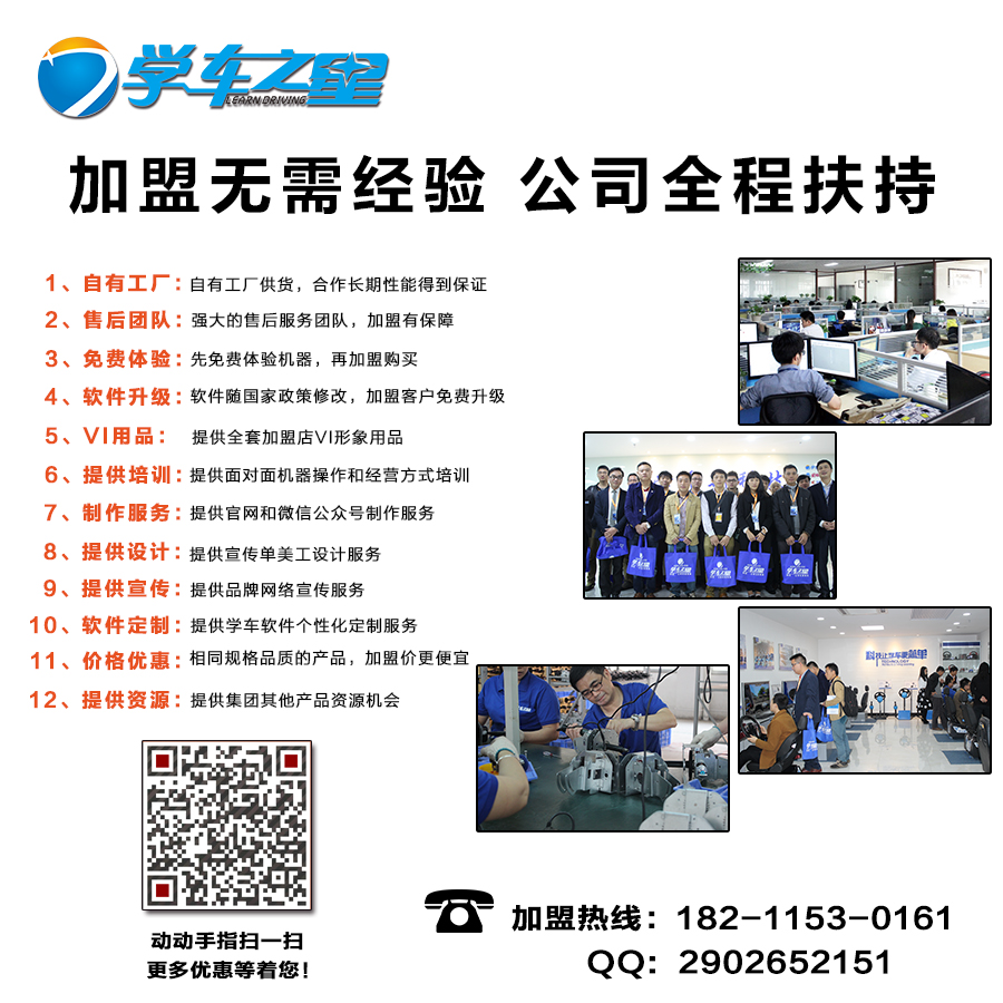 學(xué)車之星駕吧訓(xùn)練室改變了每個學(xué)員的學(xué)車模式,把“高價計時”變成“低價計時”;把“練車很無奈”變成“練車很精彩”。我們的機器是一個室內(nèi)學(xué)車的鋪助器,硬件按照真車1:1設(shè)計的,軟件里的場景也是在駕校里真實場景拍攝的,與交規(guī)同步更新,附有游戲功能,附合10-70歲人使用.