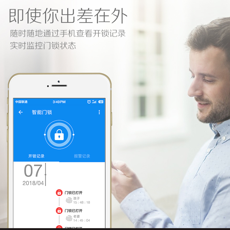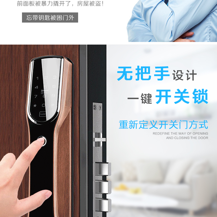智能鎖指紋識別不用壓把手,全自動開門。