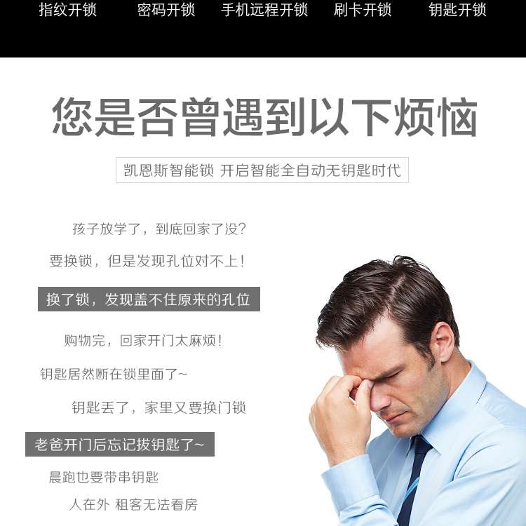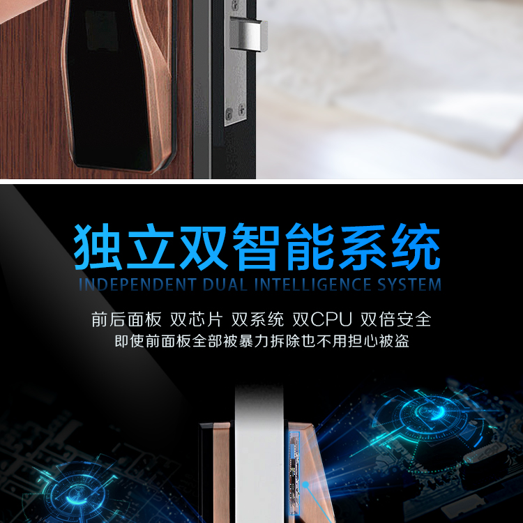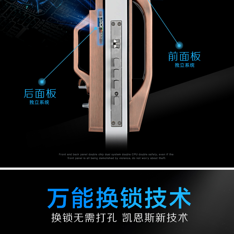 凱恩斯全自動滑蓋高端指紋鎖的開門是不用壓把手的,全自動開門,輕輕一按即可全自動上鎖,開門、關(guān)門更人性、更便捷;全自動高端智能鎖具有防貓眼開啟功能,因?yàn)榘咽质擎i定的,不可轉(zhuǎn)動開門,從根本上杜 絕從貓眼開門的可能性;智能鎖具有亂碼功能,可在正確密碼前后隨意添加數(shù)字,防止密碼被人窺竊;通配市面上95%的國標(biāo)、非標(biāo)鎖體;智能鎖擁有禁試功能,連續(xù)認(rèn)證錯誤5次,系統(tǒng)會自動報(bào)警并且鎖定,防止別人不停的驗(yàn)證,更加保障您的財(cái)產(chǎn)安 全。