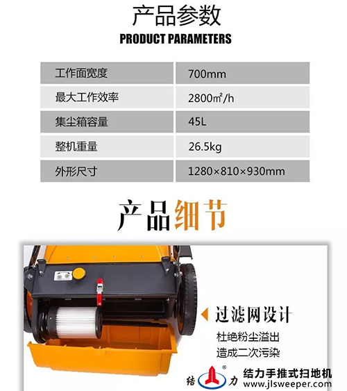 jl700 手推式掃地機(jī)是結(jié)力公司推出并擁有自主知識(shí)產(chǎn)權(quán)的升級(jí)產(chǎn)品。該產(chǎn)品在現(xiàn)有無動(dòng)力掃地機(jī)自然除塵排氣的基礎(chǔ)上,增加了機(jī)械除塵排氣裝置,將掃地機(jī)工作時(shí)垃圾箱內(nèi)形成的粉 塵氣體強(qiáng)制過濾排除箱外,還有效解除了粉 塵溢出的二次污染問題。