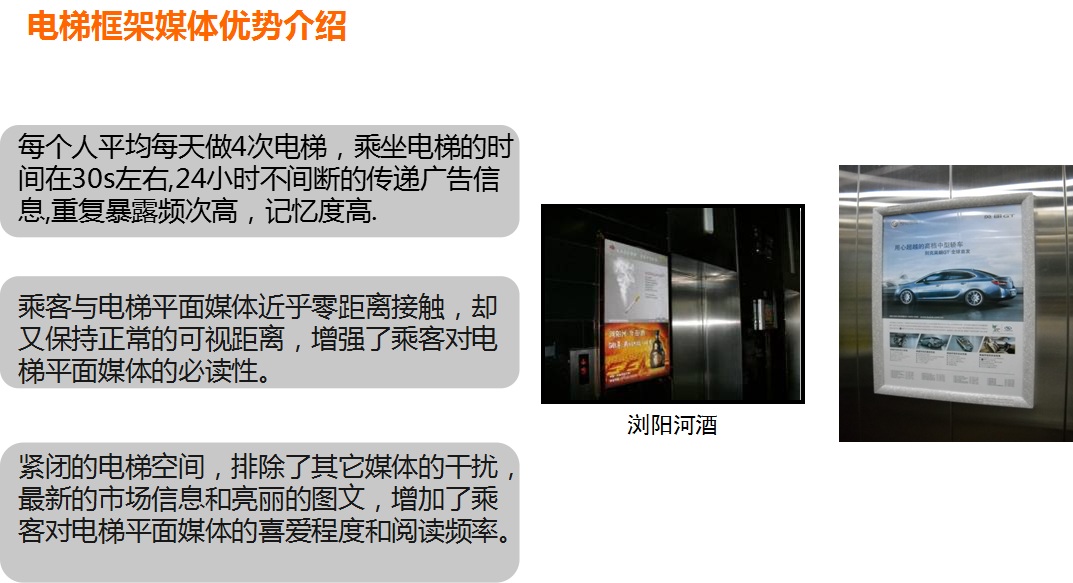 樓字電梯廣告 是動(dòng)態(tài)受眾群體與靜態(tài)廣告 內(nèi)容近距離的結(jié)合,它彌補(bǔ)了現(xiàn)有主打廣告 媒體的不足與缺憾,很好地發(fā)揮了廣告 發(fā)布在點(diǎn)、線、面、圖文等方面的信息傳播。樓宇電梯廣告 因此具有很強(qiáng)的針對(duì),是融于百姓生活,易于進(jìn)入百姓視野的一個(gè)視窗,是小區(qū)消費(fèi)之旅的重要門(mén)戶。
