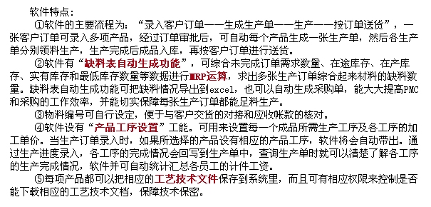 因為該版本軟件的主要功能就是1.可設(shè)置物料bom表(生成生產(chǎn)單時會自動帶出并且計算缺料)2.mrp缺料自動運算(可勾選多張訂單進行缺料統(tǒng)計并且一鍵生成采購單或者內(nèi)部生產(chǎn)單)