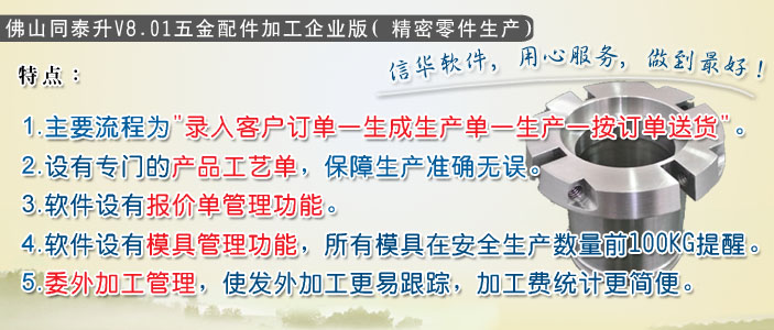 信華v8.01超級(jí)版就是為了方便生產(chǎn)現(xiàn)場(chǎng)的管理,主要流程是錄入客戶訂單—審批—自動(dòng)拆分生產(chǎn)單—審批—mrp缺料自動(dòng)計(jì)算—成品入庫(kù)—按訂單送貨—生成應(yīng)收應(yīng)付賬款,這些都是生產(chǎn)性企業(yè)最關(guān)注的幾大功能模塊。