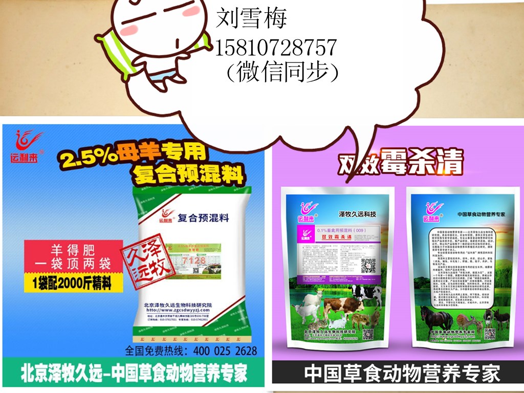 2、孕產(chǎn)母羊最忌諱飼喂冰 凍或霉菌污染的草粉 或精飼料,因霉菌無處不在,為了安 全起見,請您一定要使用本院推薦的脫霉排毒產(chǎn)品一一“雙效霉殺清”,確保母羊孕期不流產(chǎn),羔羊不腹瀉。