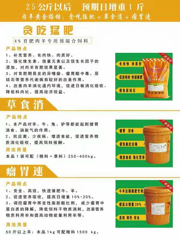 (2)4%肉羊育肥專用復(fù)合預(yù)混料——貪吃猛肥(25kg以上育肥羊?qū)S茫?/p>