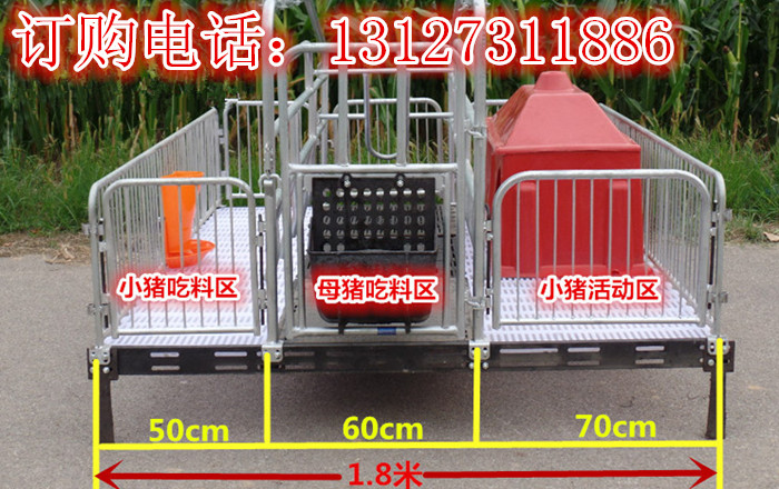 3、其它:采用螺栓連接拼裝,組裝十分簡單方便,另配有仔豬保溫箱、加熱燈、母豬用飲水器、仔豬用飲水器。母豬鑄鐵食槽,仔豬鑄鐵圓形補料槽,底部有鑄鐵橫梁支撐,鑄鐵腿。