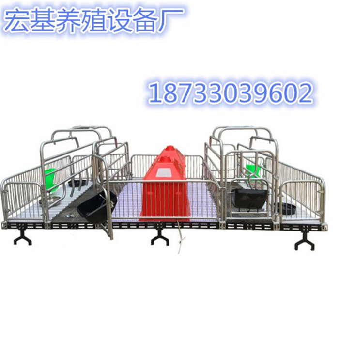 限位架最下邊的一根欄桿上面焊有彎曲的檔柱,用以保護仔豬,而不影響仔豬吃奶。母豬食槽和飲水器都在定位架的前方。