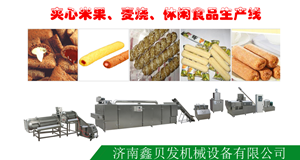 夾心米果生產(chǎn)線是在雙螺桿主機擠出膨化空心卷、餅的同時,注餡機將奶油、巧克力、花生醬等不同口味的餡料注入其中,實現(xiàn)共擠出,從而賦予了膨化食品更豐富的口味;擠出的夾心卷餅即可滾切、也可直切,可敞口、也可封口;喂料、擠壓膨化、注餡、成型、烘烤、噴涂均流水線生產(chǎn);還可變換模具生產(chǎn)各種形狀的非油炸膨化小食品及傳統(tǒng)的油炸面食產(chǎn)品。