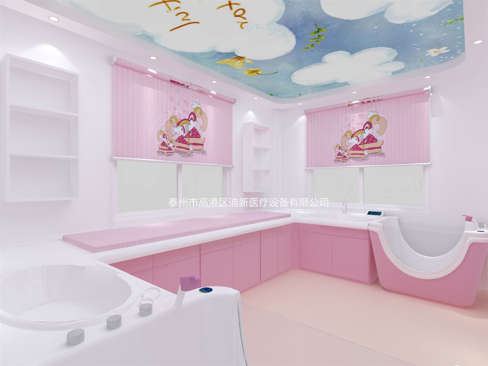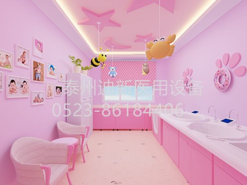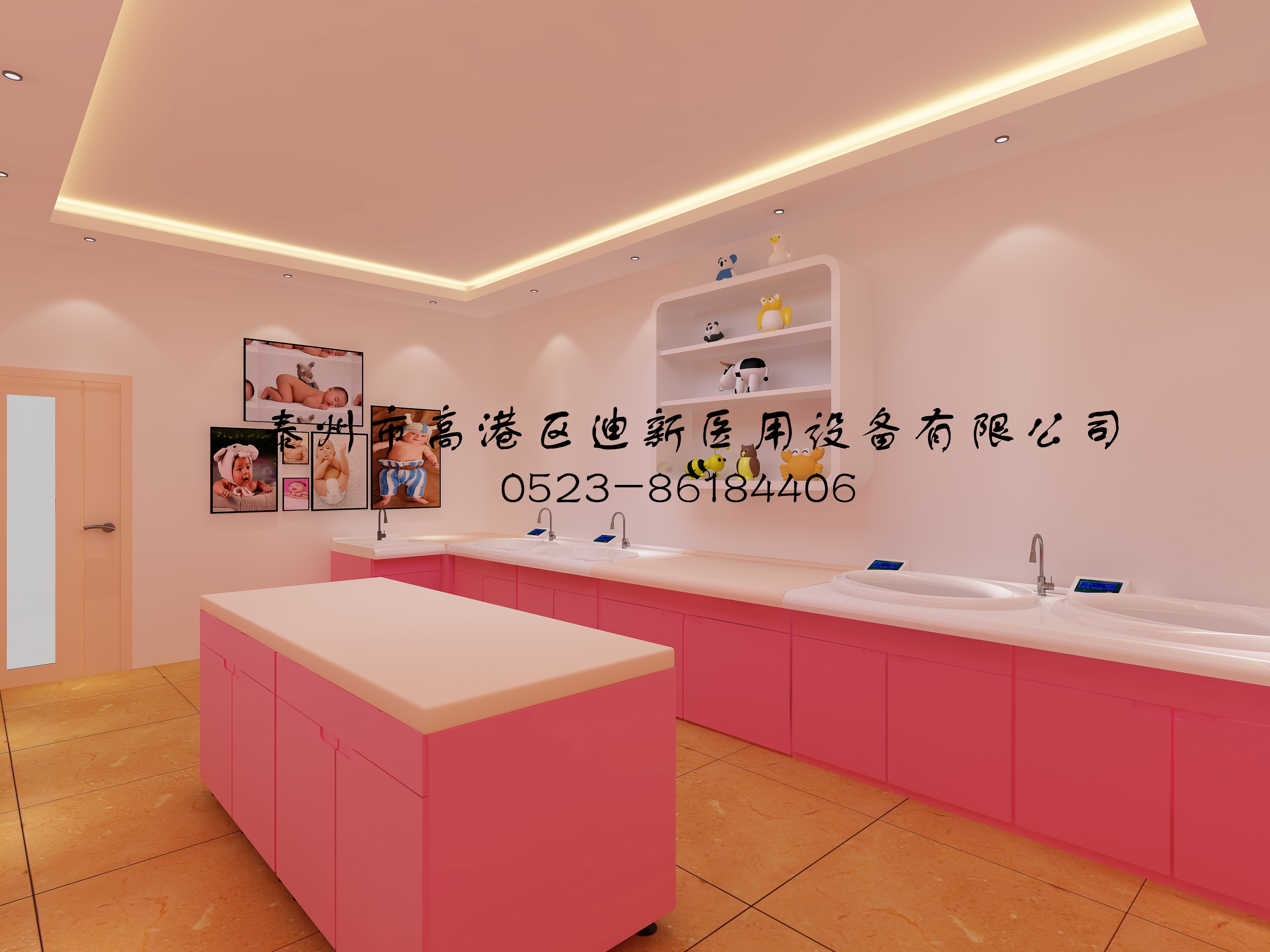 組成:嬰兒洗浴中心由嬰兒洗禮池,嬰兒游泳池,護理平臺,撫處軟包臺,洗手池組成。